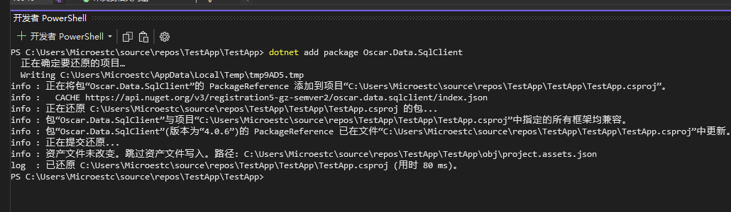 <ItemGroup> <Reference Include="Oscar.Data.SqlClient"> <HintPath>./Oscar.Data.SqlClient.dll</HintPath> </Reference> </ItemGroup>项目文件.csproj 完整内容如下