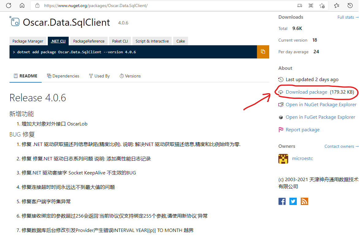 如当前最新版 v4.0.6 下载链接 https://www.nuget.org/api/v2/package/Oscar.Data.SqlClient/4.0.6