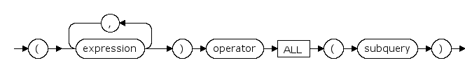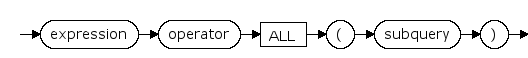 ALL 的这种形式的右手边是一个圆括弧括起来的子查询, 它必须只返回一列。左手边表达式将使用给出的operator 对子查询的结果的每一行进行一次计算和比较。 该操作符必须生成布尔结果。如果所有行的结果都为TRUE, (包括子查询没有返回任何行的特殊例子)。那么ALL的结果就是TRUE。 如果没有存在任何假值结果,那么结果是FALSE。