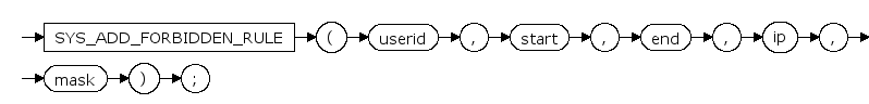 SQL> SELECT SYS_ADD_FORBIDDEN_RULE(35445,'09:50:00','09:55:00', '10.1.1.211', '255.255.255.0');
