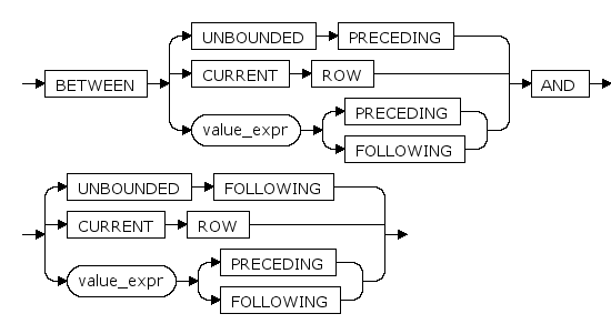 BETWEEN…AND子句用于指定窗口的起点和终点,第一个表达式位于and之前,用于定义起点,第二个表达式位于and之后,用于定义终点。如果不用BETWEEN而仅指定一定终点,则认为这个定义是起点,而终点为当前行。