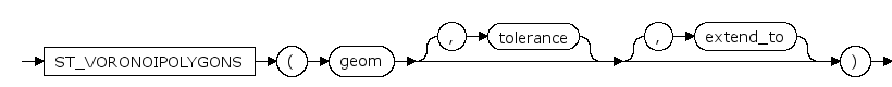 ST_VoronoiPolygons从提供的几何体的顶点计算二维Voronoi图。结果是多边形的Geometry集合,其覆盖范围大于输入顶点的范围。如果输入几何体为null,则返回null。如果输入几何体仅包含一个顶点,则返回空几何体集合。如果“延伸到”封套的面积为零,则返回空几何体集合。