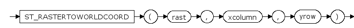 SELECT rid, (ST_RasterToWorldCoord(rast,1, 1)), (ST_RasterToWorldCoord(rast,2, 2)) FROM dummy_rast;