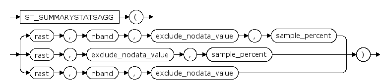 ST_SummaryStatsAgg — 聚合。返回由一组栅格的给定栅格波段的COUNT、SUM、Mean、STDDEV、MIN、MAX组成的摘要统计信息。假定带区1未指定带区。
