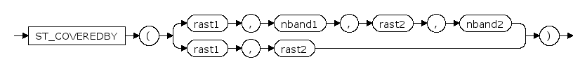 SELECT r1.rid, r2.rid, ST_CoveredBy(r1.rast, 1, r2.rast, 1) FROM dummy_rast r1 CROSS JOIN dummy_rast r2 WHERE r1.rid = 2;