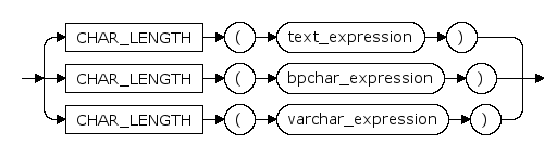 char_length ::= CHAR_LENGTH ( text_expression ) | CHAR_LENGTH ( bpchar_expression ) | CHAR_LENGTH ( varchar_expression )