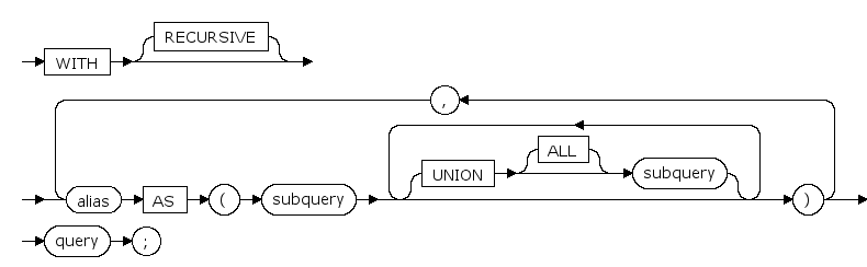 WITH RECURSIVE cte1(a) AS(SELECT * FROM t1),cte2(aa) AS(SELECT * FROM cte1 UNION ALL SELECT 3,4 UNION ALL SELECT * FROM (SELECT cte2.aa+1,cte2.b FROM cte2 WHERE cte2.aa<5) a)SELECT * FROM cte2 ORDER BY 1,2;